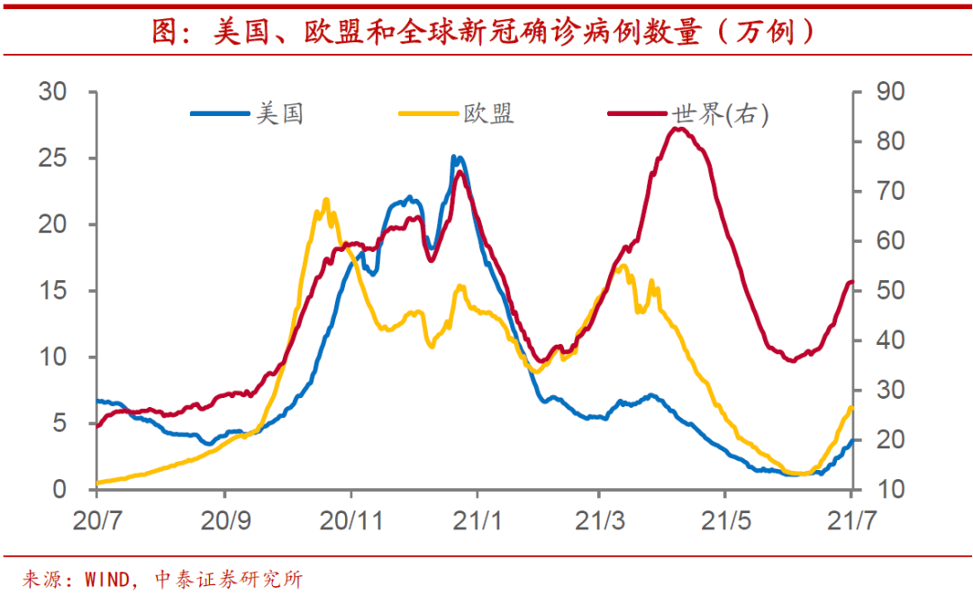 Delta毒株扩散,疫情再拾升势。近期全球新冠肺炎确诊病例数量触底反弹、再拾升势,分区域来看,欧洲疫情不容乐观,美洲疫情态势相对缓和。