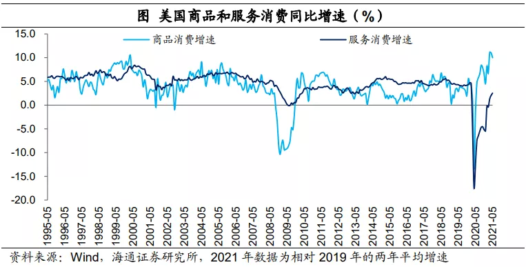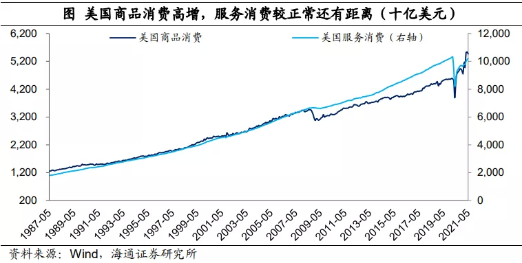 其次,从绝对水平来看,即使在08年金融危机时美国居民收入大幅下降、财富明显缩水的情况下,当时美国服务消费也只是回落至正常水平的94%,而当前美国居民收入大幅增长、财富明显增值的情况下,服务消费也只恢复到正常水平的94%附近。所以从绝对水平来看,美国居民服务消费也有进一步提升的空间。