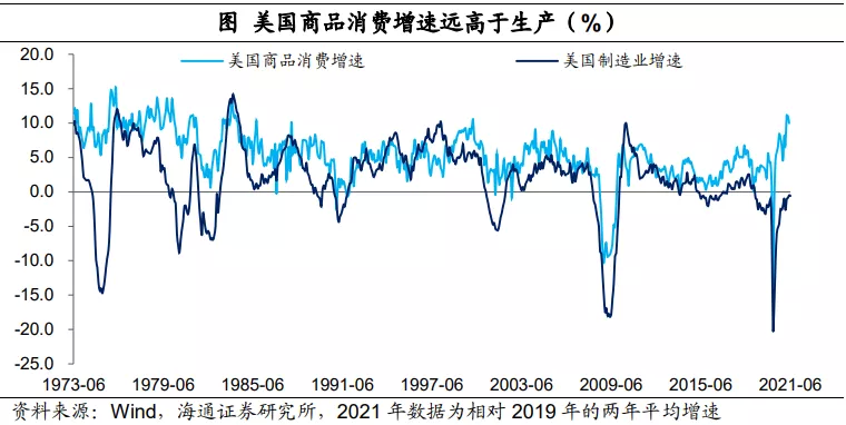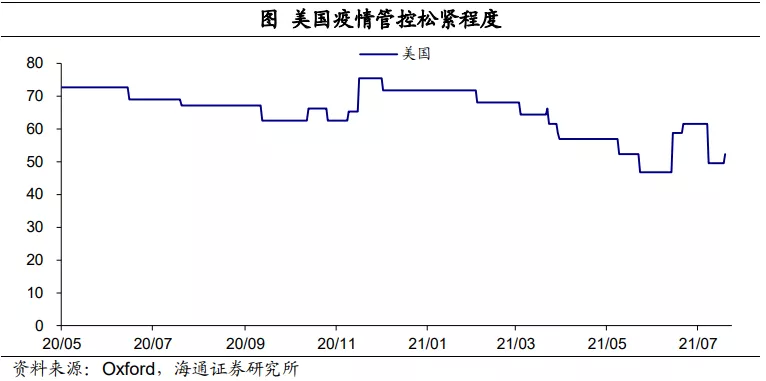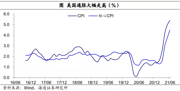 但是美国需求端依然很强劲,供给和需求错配,美国通胀水平仍在大幅上行。6月美国整体CPI同比达到5.4%,核心CPI同比也有4.5%,基本上是过去30年最高的水平。尽管有基数因素的影响,但6月核心CPI环比也有0.8%,也是过去30年最高的。尤其是管控措施逐渐放开后,服务业的通胀压力已经在显现出来。量偏弱、价走高,美国当前面临的是类滞胀环境。