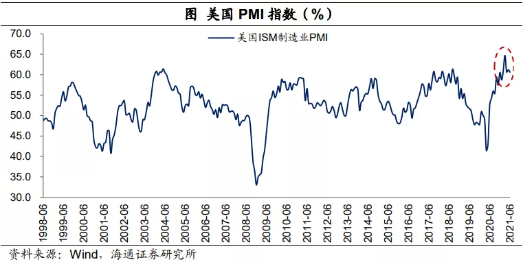 但是,从环比指标来看,美国制造业PMI在今年3月达到64.7%的高点后,趋势就已经在回落。这说明美国制造业环比恢复最快的时候可能已经过去了,但考虑到制造业的改善空间,短期内美国制造业PMI或维持在高位震荡,出现明显下行的可能性也不大。