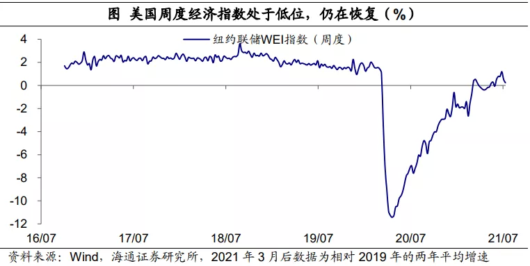 所以当前美国经济依然受到疫情防控影响,服务业和制造业供给端依然受到限制。截至7月,纽约联储WEI指数(两年平均)还不到1%,而在疫情之前基本都在1.5%以上的增长,还有进一步提升的空间。