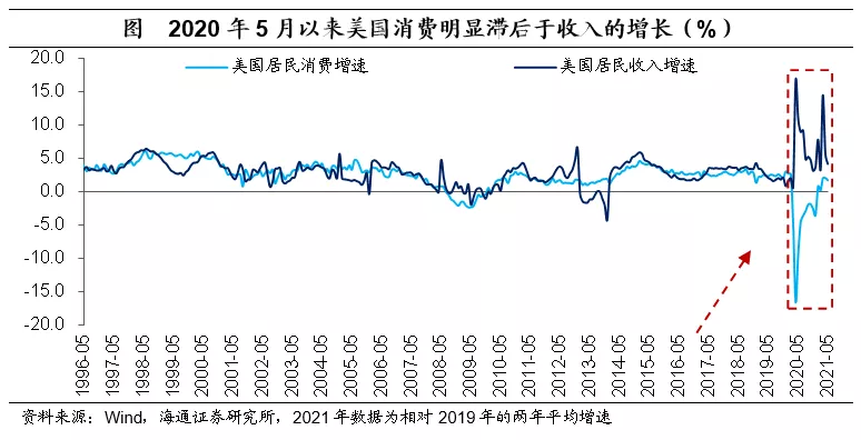 美国的商品消费增速或已见顶了,那么美国服务类消费还有没有修复空间呢?明显是有的。首先,从收入和消费的关系来看,美国居民收入并没有受到疫情的影响,反而增速更高,理论上来说,美国居民消费增速也应该更高才对,这一点从商品消费的高增长也可以看得出来。但是现在服务类消费增速还处于比较低的位置,随着美国疫情管控措施的放开,服务类消费增速有更大的提升空间。
