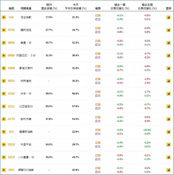 上周五恒指相关权证的平均引伸波幅报约21.3%,按日上调0.9个百分点。个股方面,快手相关认购证及认沽证引申波幅同时上调超2%。