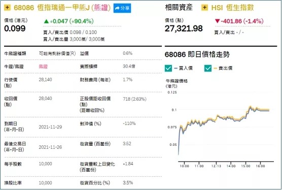 1、强势轮证:恒指瑞通一甲熊(68086.HK),上周五大涨90.4%;
