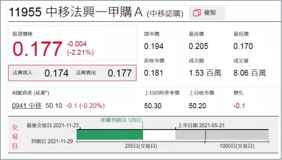 2、看错方向:中移法兴一甲购(11955.HK),上周五小幅下跌2.21%。