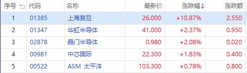 华盛资讯7月26日消息,芯片概念股今日低开高走,其中,上海复旦涨幅扩大逾10%,华虹半导体、晶门半导体涨超2%,中芯国际涨超1%,ASM太平洋亦获拉升转涨。