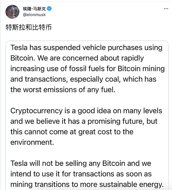 当马斯克又一次谈及比特币时,加密资产市场已经时过境迁。早前的5月13日,特斯拉宣布暂停接受比特币支付,马斯克在推特表示,「我们对比特币挖矿和交易中使用化石燃料的迅速增加感到担忧。」