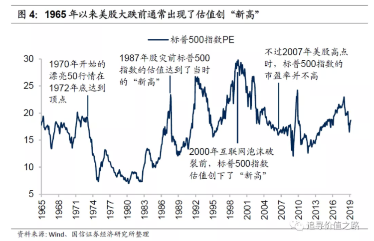 1987年股灾前,标普500指数的估值也达到了当时的“新高”,不过当时的估值与股价走势基本是完全同步的,对当时的市场来说,估值就是股价、股价就是估值,从操作上讲,用估值高低去判断股价没有指导意义。事后来看,通胀预期开始升温,美国贸易逆差数据超预期带动美元汇率走弱,利率上行可能是导致股灾发生的原因,而美国国会宣布立法取消与企业收购融资的相关税收优惠政策、美国证监会主席表示在关键时刻可能暂时关闭交易所等政策性因素是影响市场情绪、造成股市大跌的催化剂。