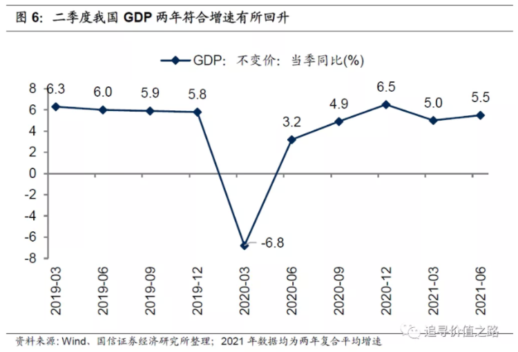 从基本面角度来看,我国经济及企业盈利仍然保持较为强劲的增长。最新GDP数据显示,2021年二季度我国经济增长景气度有所改善。2021年二季度中国实际GDP当季同比增长7.9%,两年平均同比增速为5.5%,两年平均同比增速较一季度回升0.5个百分点。从季调后环比来看,2021年二季度GDP季调后环比为1.3%,明显高于一季度的0.4%,也高于2019年二季度的1.0%。无论从两年平均同比增速还是季调后环比增速来看,2021年二季度国内经济增长景气度均高于一季度。可见在冬季疫情大幅拖累今年一季度国内经济增长后,随着疫情的负面影响逐渐减弱,二季度国内经济增长开始向上修复。