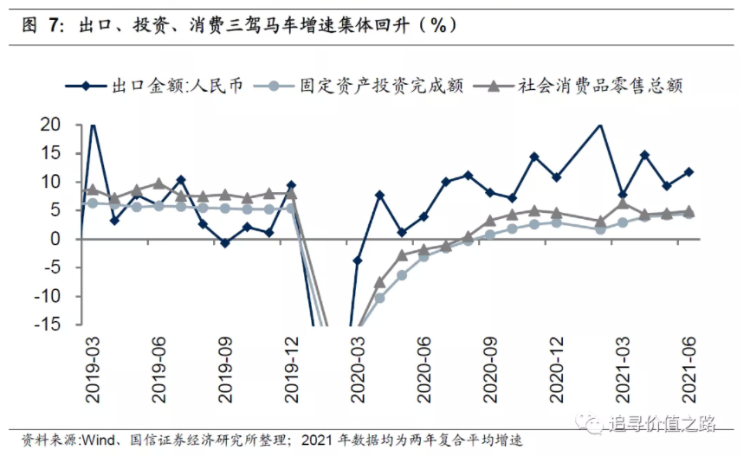 结构上看,出口、投资、消费三驾马车增速6月份集体回升。6月社会消费品零售总额两年平均同比增速为4.9%,较5月继续上升0.4个百分点,表明6月国内消费景气度继续回升。固定资产投资6月两年平均同比增速为5.7%,较5月上升1.0个百分点。6月中国出口(人民币计价)两年平均同比增速为11.8%,较5月上升2.4个百分点。