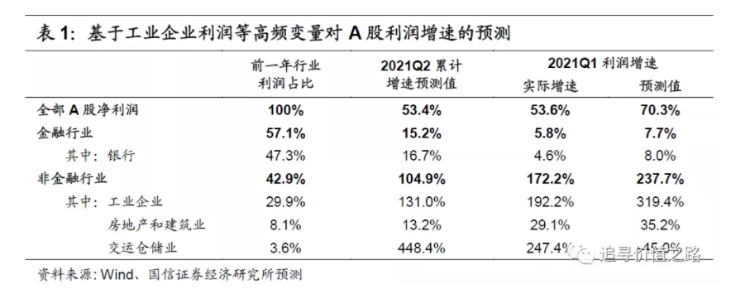 根据目前已经公布的宏观基本面数据,国信策略团队构建的高频盈利跟踪模型显示,二季度A股上市公司整体利润增速预计小幅回落,整体仍将维持50%左右的增速快速增长。结构上看,非金融企业利润同比增速的高点出现在一季度,二季度将显著下滑至105%,其中工业企业利润累计同比增速预计为131%,维持较高水平但显著低于一季度,这主要是因为部分中下游制造业企业的利润增速在低基数效应减弱情况下开始向正常水平回归,而部分上游资源品如煤炭、有色金属等行业的利润在商品价格持续上升的背景下预计将加速增长。此外,受益于净息差走阔、资产质量好转同时叠加低基数效应,二季度银行业利润同比增速预计将上行至16.7%,并带动整体金融行业的利润增速上升至15.2%。