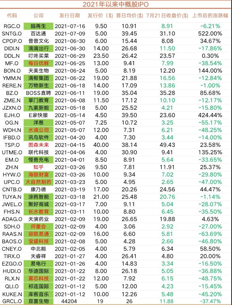 今年发行的中概股大都出现了下行趋势,截止7月21日收盘,38只中概股有25只涨跌幅为负值,比例超过65%。