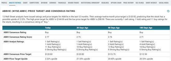 目前共有13位华尔街分析师给出ABBV的目标价,平均目标价为$120.82,其中1位“卖出”评级、1位“持有”评级,11位“买入”评级。