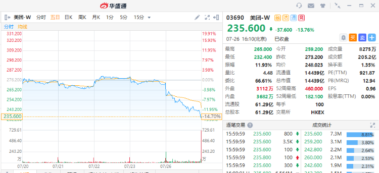 7月26日下午,港股美团跌超13%,此前跌幅一度接近15%,创下历史最大跌幅。