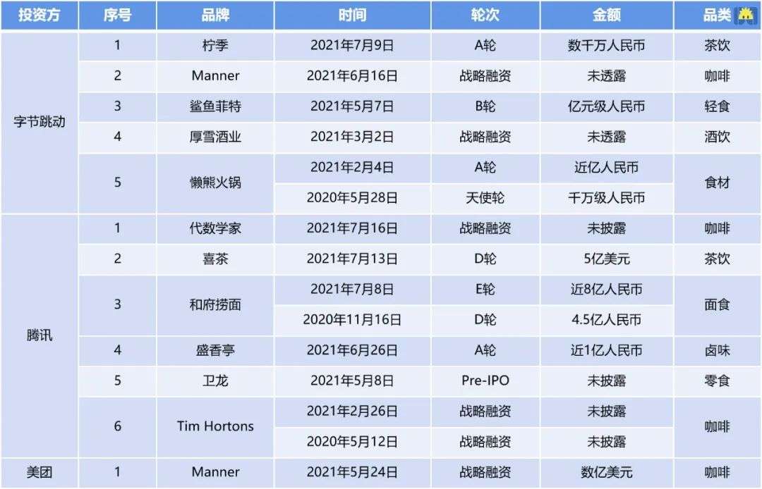 半年时间里,以字节跳动和腾讯为首的互联网巨头们就在曾经入不了法眼的餐饮消费领域,砸重金拿下12个项目,且赛道集中、争抢激烈。