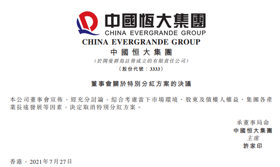 7月27日消息,中国恒大在港交所公告,本公司董事会宣布,经充分讨论,综合考虑当下市场环境、股东及债权人权益、集团各产业长远发展等因素,决定取消特别分红方案。