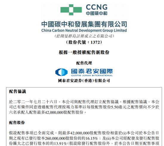 中国碳中和:公司折让6.6%配售4200万股 筹资2.31亿港元