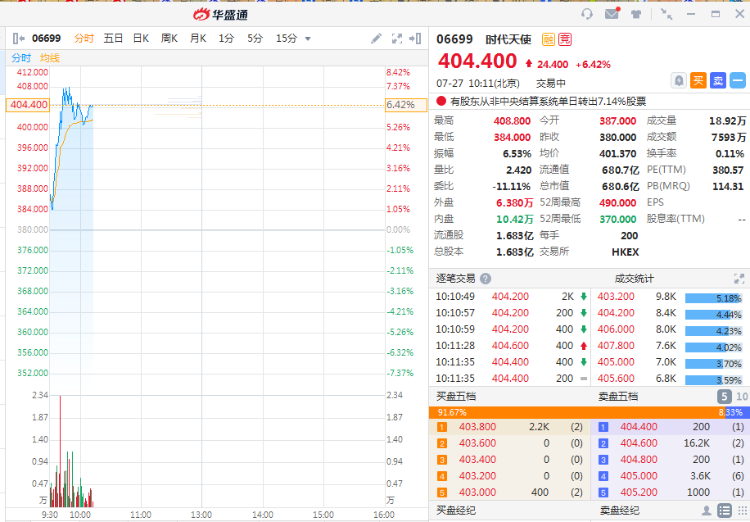 华盛资讯7月27日消息,时代天使早盘走高,截止发稿,现涨6.42%,报404.4港元,总市值680亿港元,成交额7593万港元。
