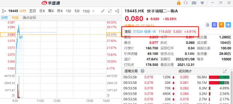 相关涡轮方面, $19445.HK 快手瑞银二一购A涨33.33%,其行使价为168.78港元,到期日为2022年1月6日,溢价47.64%。