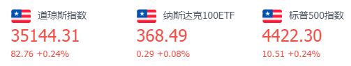 道指涨82.76点,或0.24%,报35144.31点;纳指涨3.72点,或0.03%,报14840.71点;标普500指数涨10.51点,或0.24%,报4422.30点。