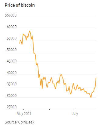 比特币价格周一跳升至六周高点,一些投资者将这一涨势归因于空头头寸被平仓,以及对亚马逊公司可能涉足数字货币的猜测。道琼斯市场数据显示,比特币一度飙升至40501.70美元,达到6月中旬以来的最高水平。较美国东部时间周日下午5时的水平上涨9%。另一种加密货币以太币跳涨4.8%。