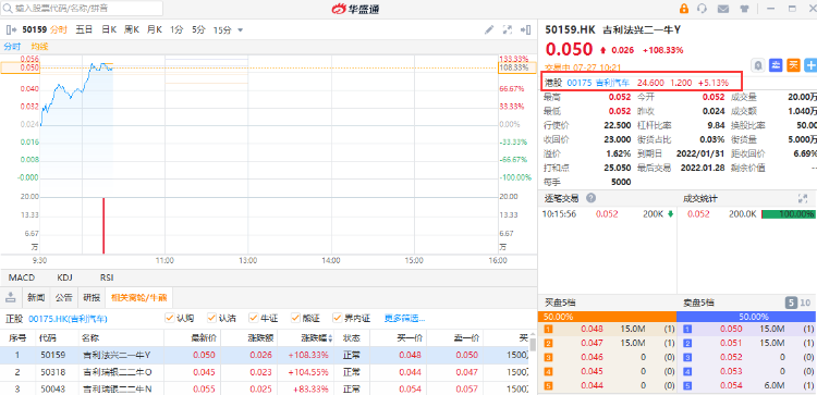 相关涡轮方面,吉利法兴二一牛Y $50159.HK 涨108.33%,其行使价为22.50港元,到期日为2022年1月31日,溢价0.61%。