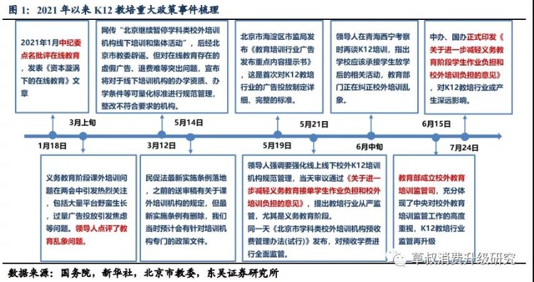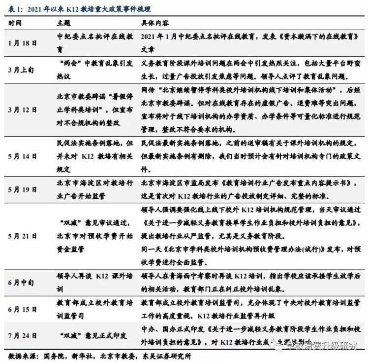 2021年以来中央和监管就K12教培问题高度重视,密集发声:自从2021年1月中纪委点名批评在线教育以来,这半年来加强K12教培监管问题获得了中央高度重视,领导人多次点评K12培训,要求强化学校的主体作用,而对于K12教培则应加强监管。各部门表示高度重视,5月21日“双减意见”通过,教育部于6月15日公布成立校外教育培训监管司,7月24日“双减意见”正式印发,北京,上海,广州等各地也相对的出台了一些具体监管措施等。