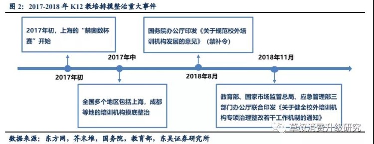 从2017年开始,监管部门就课外培训机构就进行摸底整治,上轮整治主要针对的培训机构的资质问题,并未对行业增长主逻辑带来太大影响:2017年初,上海的“禁奥数杯赛”开始,2017年中,全国多个地区包括上海,成都等地的培训机构摸底整治,2018年2月,“教育部办公厅等四部门关于切实减轻中小学生课外负担开展校外培训机构专项治理行动”,2018年8月,国务院办公厅印发《关于规范校外培训机构发展的意见》(禁补令)。2018年11月26日,教育部、国家市场监管总局、应急管理部三部门办公厅联合印发《关于健全校外培训机构专项治理整改若干工作机制的通知》。2018年那一轮整治主要针对的是教培机构的资质问题,比如办学许可证,工商执照,消防相关证明,教室面积,教师资格等,结果是大量小机构出现被取缔与淘汰的情况。