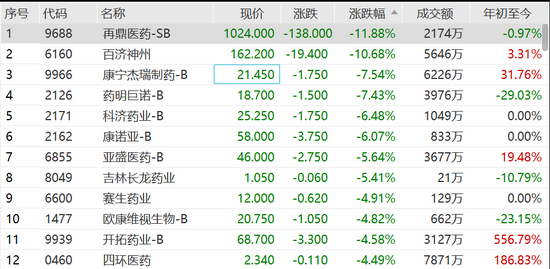 医药股集体大跌,再鼎医药跌12%,百济神州跌10%,康宁杰瑞制药、药明巨诺跌超7%,阿里健康跌14%,京东健康跌10%。