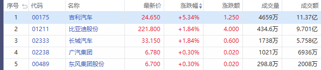 比亚迪股份、长城汽车上涨1.84%;广汽集团、东风集团股份微涨。