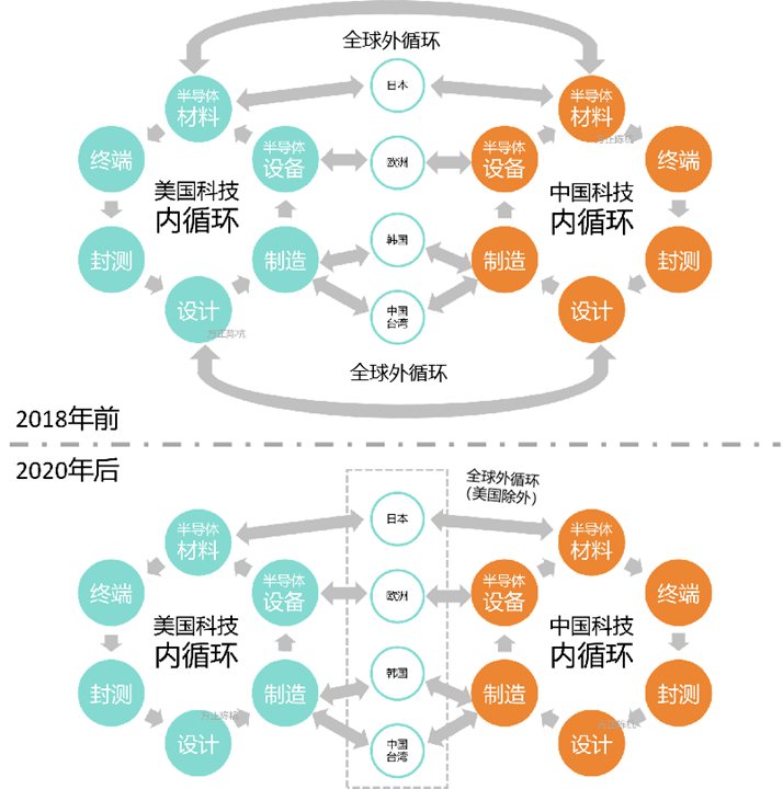 全球科技格局将重新洗牌,呈现逆全球化的返祖状态。即使强如美国也只参与了半导体产业的小部分环节,中、欧、日、美、韩、中国台湾,各自占据了产业链不可或缺的部分。