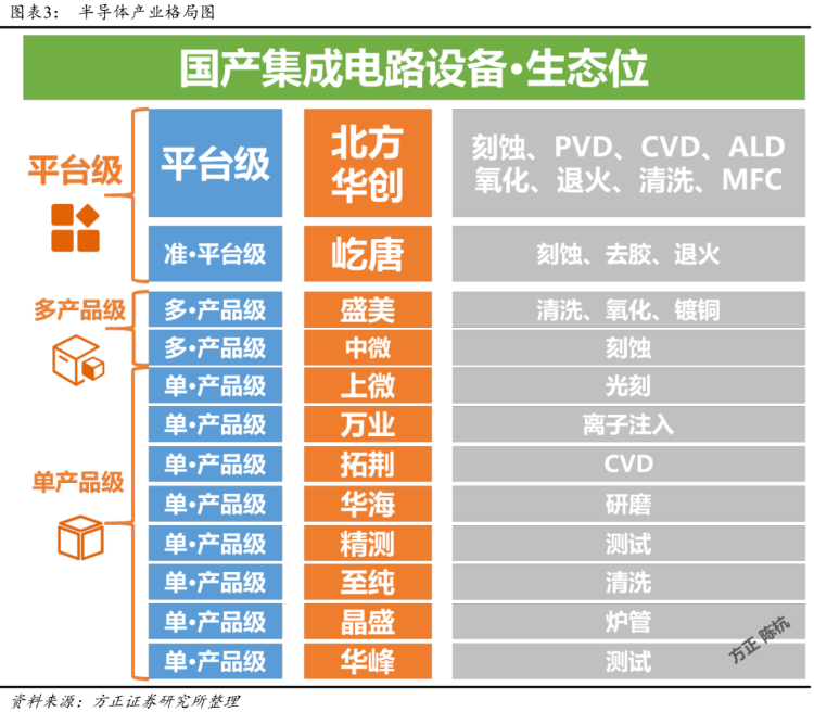 1)平台级:北方华创(刻蚀机、PVD、清洗机、CVD、ALD、氧化、退火、MFC);