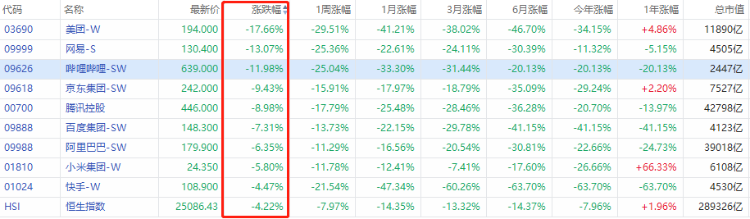 到了周二,教育股的跌势已经有了明显放缓,但以ATM为代表的互联网大厂们依然跌势不减,拖累整体大市再次出现跳水。截至收盘,美团再跌超17%,腾讯跌幅逼近9%。恒生指数盘中最低跌破24750点(近-6%),两日最大跌幅超2500点。