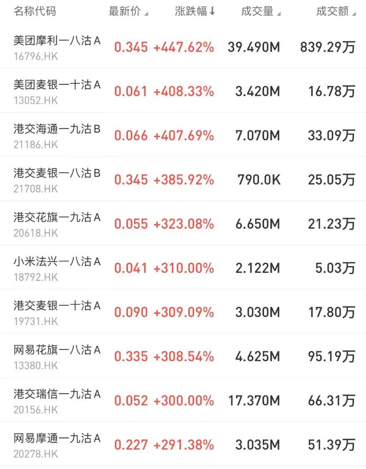 涨幅居前的包括:美团摩利一八沽A暴涨447.62%,占据排行榜第一,美团麦银一十沽A涨408.33%;港交海通一九沽B涨407.69%。