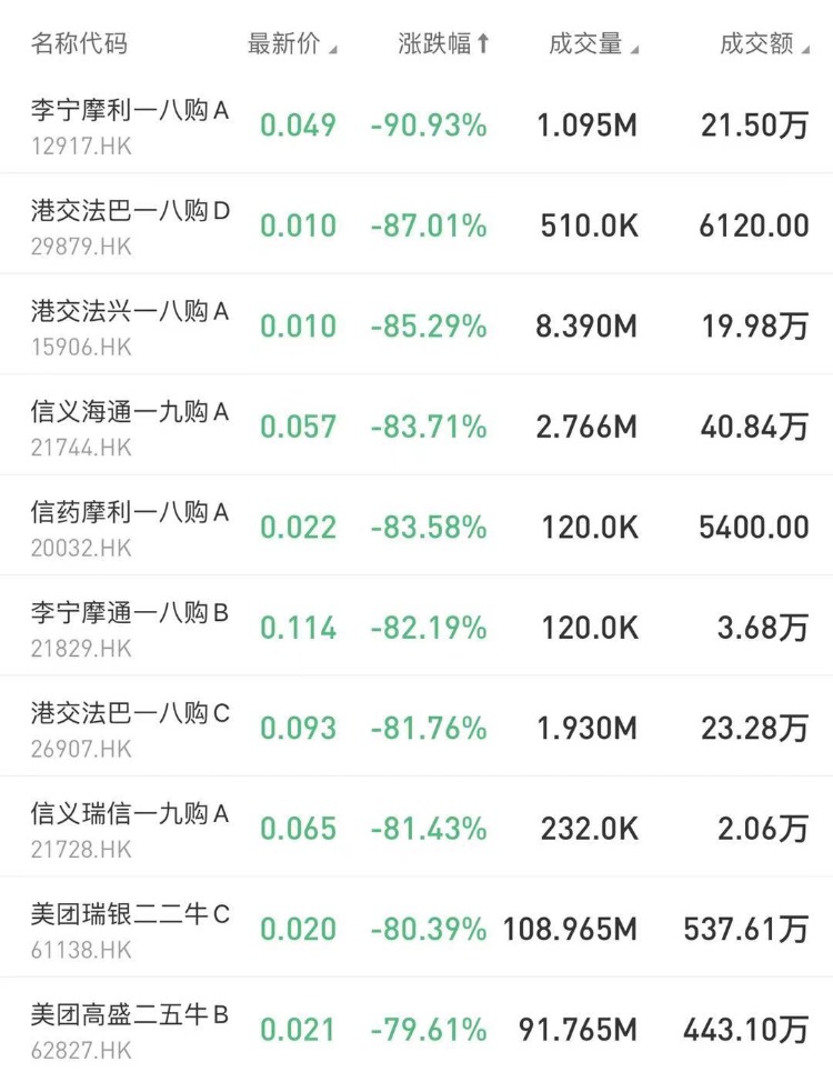 在今日跌幅榜中,李宁摩利一八跌90.93%;港交法巴一八购D跌87.01%。