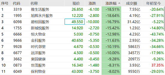 物管股暴跌,雅生活跌18%,旭辉永升跌超18%,新城悦跌15%,碧桂园服务跌16%。