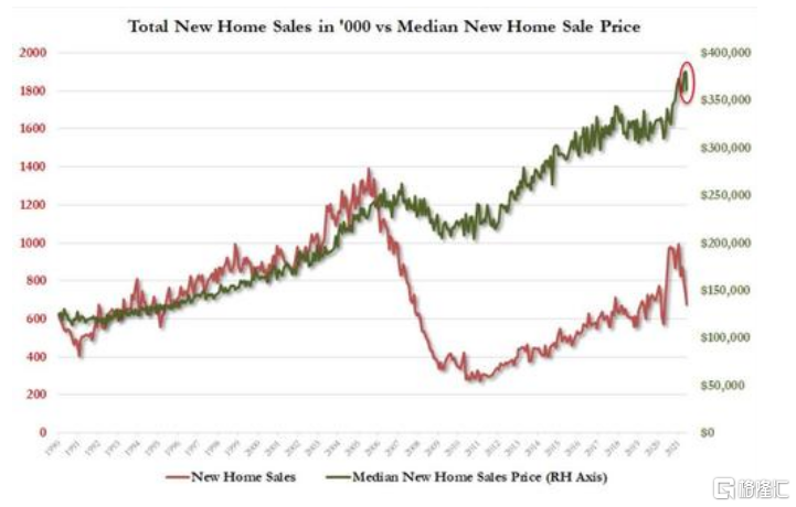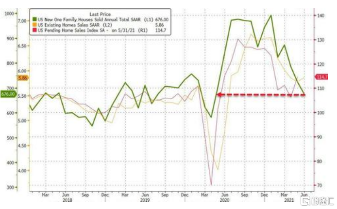 楼市数据方面,美国6月新屋销售数据显示,尽管房价刷新历史高位,但通胀高企下的需求疲软已使得新屋销售户数环比不增反降6.6%,与市场预期的增长4%严重偏离,达到2020年4月来最低水平,显示火爆的楼市可能在降温。