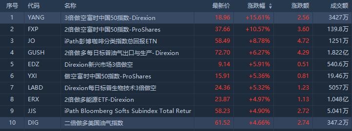 ETF涨幅榜方面,追踪亚太地区中国股票的做空ETF暴涨,涨幅居前的是3倍做空富时中国50指数大涨15.61%,成交额3427万美元;2倍做空富时中国50指数ETF涨10.57%。
