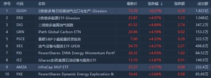 能源ETF涨幅榜方面,2倍做多每日标普油气出口与生产ETF涨6.27%,成交额1.82亿美元;2倍做多能源ETF涨4.97%,成交额1.05亿美元。