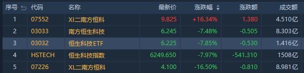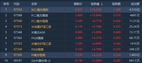 今日涨幅位居前的ETF有南方两倍做空恒科涨大涨16%,成交额4.51亿港元,两日累计暴涨超30%;南方两倍看空国指涨10.44%,成交额4681万港元。