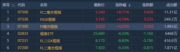 受消息影响,今日港股涨幅居前的ETF有南方两倍看空恒指(07500.HK)涨8.71%,成交额11.31亿港元;