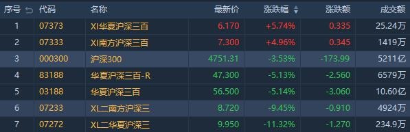 沪深300指数收跌3.53%。其中,华夏沪深三百-R(83188.HK)跌5.13%,成交额6579万港元;华夏沪深三百ETF(03188.HK)跌5.14%,成交额10.60亿港元。