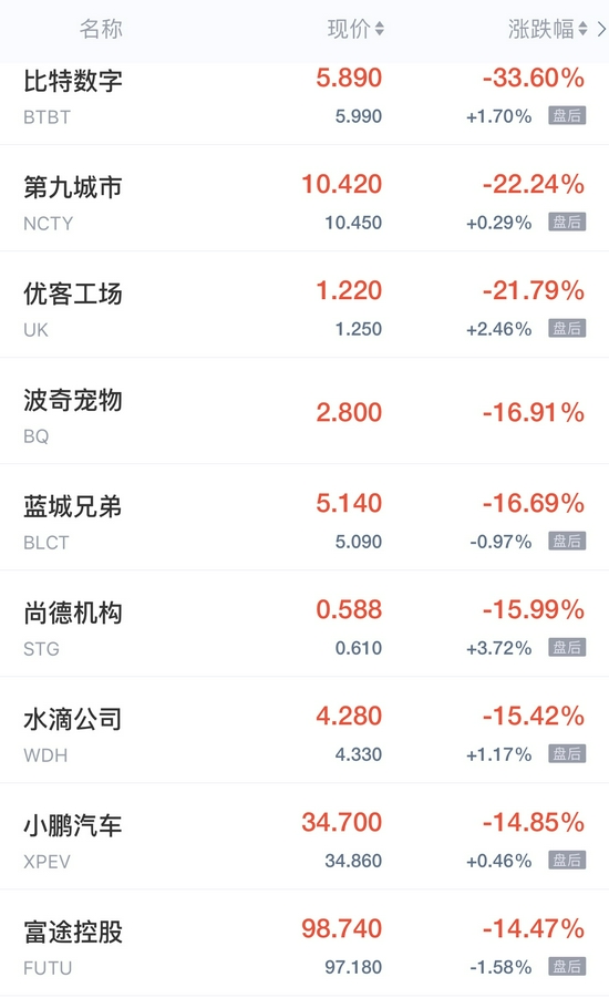 优客工场跌近22%,波奇宠物跌近17%,蓝城兄弟跌超16%,尚德机构跌近16%,水滴公司、万物新生跌超15%,趣头条跌超11%,拼多多跌超10%,云米科技跌近10%,虎牙、世纪互联跌超8%,微美全息、搜狐跌超7%,联代科技跌近7%,斗鱼、36氪、优信跌超6%,哔哩哔哩、前程无忧跌超5%,唯品会跌超4%,雾芯科技跌超3%,阿里巴巴、百度跌近3%,京东、爱奇艺跌近2%,网易跌超1%。