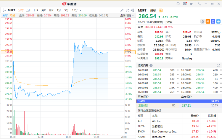 微软第四财季调整后每股收益和营收均超出华尔街分析师预期,盘后股价微涨。