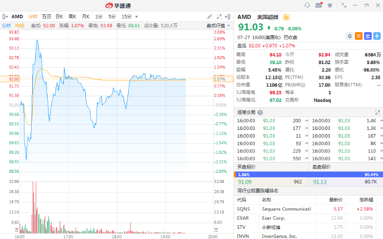 AMD第二季度业绩超出华尔街分析师此前预期,且第三季度营收展望也超出预期,从而推动其股价在盘后交易中上涨逾1%。