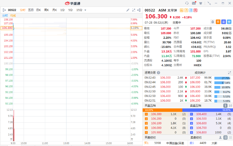 ASM 太平洋(00522.HK)涨6%,报106.3港元,总市值436亿港元。