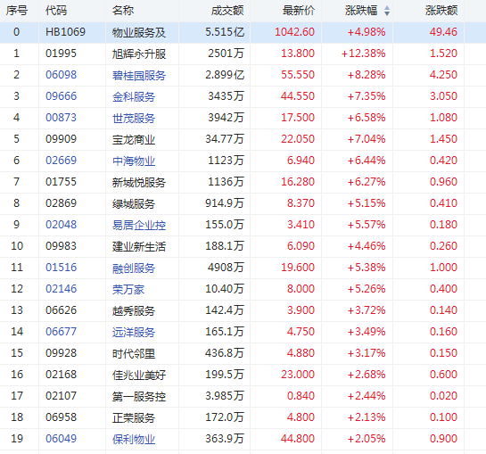 物管股高开,新城悦服务(1755.HK)涨6%,碧桂园服务涨超8%,世茂服务涨超6%,雅生活服务、佳兆业美好、融创服务等纷纷上涨。