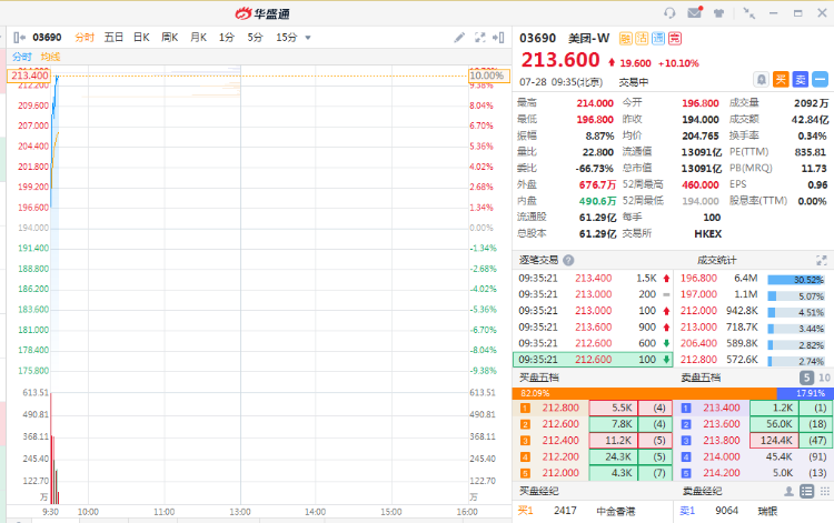 美团上演暴力反弹:股价大涨10%,重返200港元大关