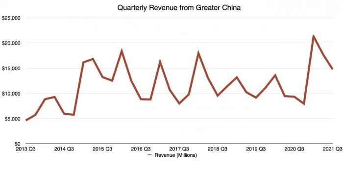 大中华地区的销售收入达到147.6亿美元,同比增长58%,增幅领先各地区。尽管与2021财年前两个季度一样呈现大幅增长态势,同比增幅弱于上一财季的逾87%。