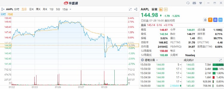 或许是因为供应链问题恐将在第四财季限制iPhone和iPad,再加之上述的反垄断纠纷和新冠疫情的变化,苹果当日盘后还是扩大跌幅至2.4%。截止7月28日收盘,苹果的股价跌1.22%,报144.98美元。
